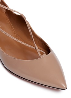 Aquazzura这款平底鞋的尖头款式给予人摩登感觉,加入独一无二的绕带及镂空设计后,散发女性妩媚的韵味,裸色光滑真皮透出优雅和高贵,彰显您独有的时尚态度。