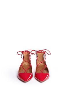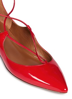 Aquazzura这款平底鞋的尖头款式给予人摩登感觉,加入独一无二的绕带及镂空设计后,散发女性妩媚的韵味,亮丽的红色漆皮青春有活力,彰显您独有的时尚态度。
