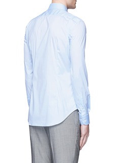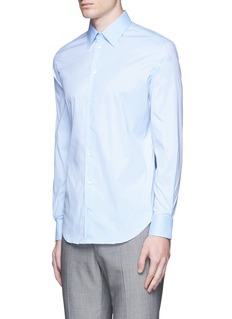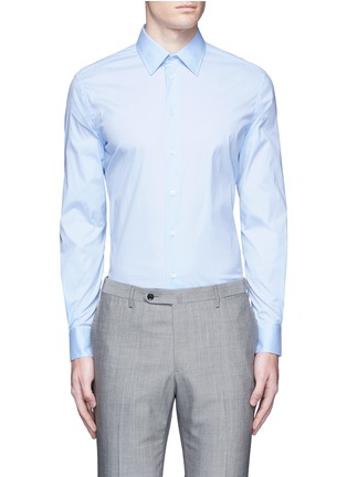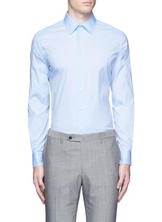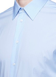 浅色衬衫可让人看起来更精神醒目,这款阿玛尼黑标的衬衫是不错的选择,将修身剪裁与柔软富弹性的府绸面料结合,伸展或活动时格外自如,清新的浅蓝色让您更显年轻,可搭配灰色长裤,打造稳重大气的上班造型。