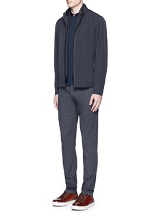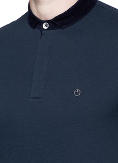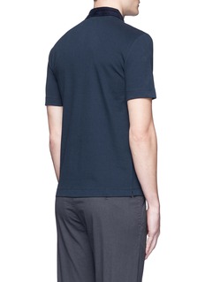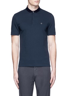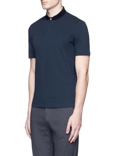 polo衫随着运动风潮兴起而成为近季流行的单品,阿玛尼黑标此款选用富弹性的棉质珠地布制成,具有极佳的透气度,有效保持身体干爽,选用深蓝色灯芯绒拼成窄翻领,令触感更具变化,修身剪裁彰显男士精神一面,摩登又有型。