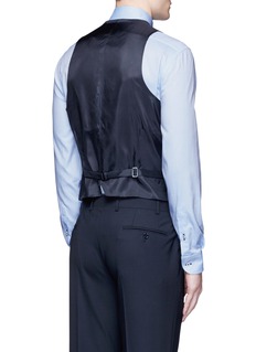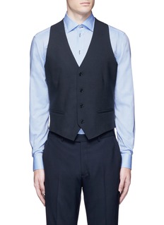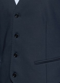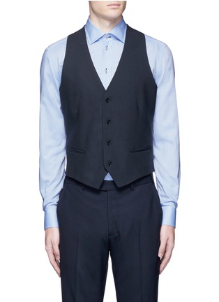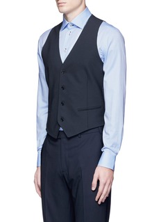 阿玛尼黑标此款西服马甲令正装造型变得更绅气有型,采用富弹性的羊毛面料与光滑缎面面料作拼接,舒适轻盈又可活动自如,蓝黑色低调稳重,与浅色衬衫是最佳组合。