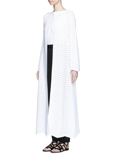 阿瑟丁阿拉亚这款长大衣采用纯白色设计,通身缀满镂空波点及锯齿花纹,呈现清新自然格调,喇叭廓形修饰腰线同时令身材更显高挑,从简约细节中展现鲜明个性。