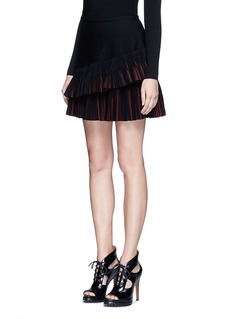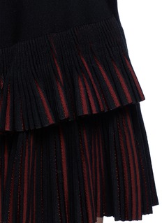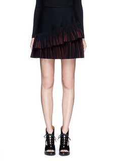 阿瑟丁阿拉亚擅长结合弹性针织面料及修身剪裁,以贴身的服饰彰显女性的身体曲线。此款半身裙的混羊毛针织面料柔软且弹性极佳,黑色及酒红色拼出富垂坠感的百褶裙摆,正面采用双层设计,令步姿更显灵动优美。