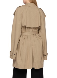 Soft tailoring meets subversive proportion in this cropped trench by Balenciaga. Rendered in fluid jersey, it reworks a heritage silhouette with ease and attitude—ideal layered over sharp tailoring or styled loose for directional city dressing.