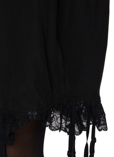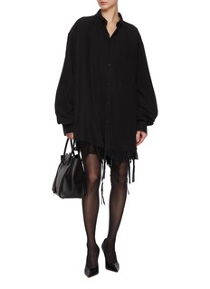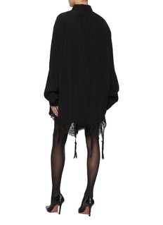Blurring the lines between tailoring and sensuality, this oversized shirt dress by Balenciaga is rendered in fluid lyocell poplin with delicate lace and lingerie-inspired trim peeking from beneath the hem. An ode to the unexpected, it pairs seamlessly with sheer tights and heels for an evening look infused with subversive elegance.
