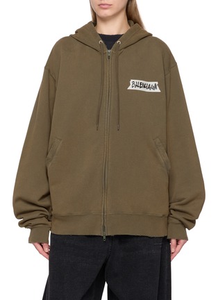 A study in deliberate wear and graphic irony, this zip-up hoodie channels Balenciaga’s deconstructed codes through worn-in finishes and trompe-l’œil masking tape motifs placed front and back. Cut oversized in dry cotton fleece, it layers effortlessly over casual looks, grounding everyday dressing with subversive ease.
