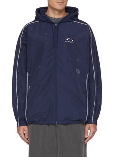 This sleek and stylish jacket is made with technical fabric, ensuring durability and protection against the wind. The contrast piping and paint-splattered prints offer a bold and modern twist to the classic windbreaker, while the iconic Balenciaga logo on the chest adds a touch of branded luxury.