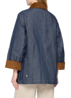 Balancing heritage utility with an easy, modern proportion, this casual jacket reworks Barbour’s countryside codes through a soft denim lens. The contrast corduroy collar and cuff trims frame the silhouette, making it a refined layer for everyday dressing, from crisp shirting to relaxed knits.