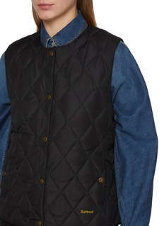 This classic Barbour quilted vest in a sleek black finish is the epitome of versatility and style. Designed to provide additional warmth without bulk, it features a refined diamond quilting pattern, gold-toned snap buttons, and a neatly tailored silhouette that layers effortlessly over any ensemble.