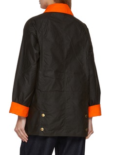 This striking Barbour jacket combines classic style with a bold twist. The deep olive fabric is accented with vibrant orange on the collar and cuffs, adding a pop of colour that makes this piece stand out. Ideal for adding a splash of colour to rainy days.