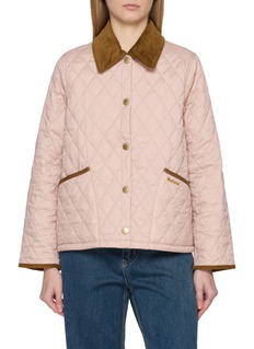 Embrace timeless elegance with this Barbour quilted jacket, featuring a soothing beige hue complemented by a contrasting corduroy collar for a touch of classic charm. The jacket is adorned with metallic snap buttons and practical front pockets, perfect for keeping essentials close at hand.