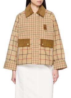 Barbour's heritage-inspired jacket combines classic check patterns with textured corduroy accents for timeless countryside appeal. The boxy silhouette features signature details including flap pockets, D-ring hardware, and tonal embroidered branding. Relaxed proportions and mixed-pattern blocking create a contemporary take on British outerwear tradition.