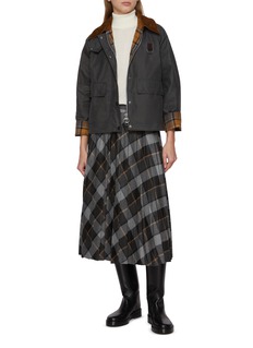 This Barbour jacket is a testament to timeless style and durability, featuring a button up front with a plush contrast collar and utility pockets for functionality. Its distinctive cuff detailing with tartan accents on the cuff lends a touch of heritage flair.