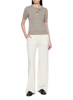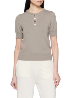 A refined everyday piece elevated by subtle eccentricity, this short sleeve knit is crafted from a soft cotton–cashmere blend that feels light yet indulgent against the skin. The mismatched button placket adds a quiet point of interest, making it an effortless choice for polished daytime looks or understated evening layering.