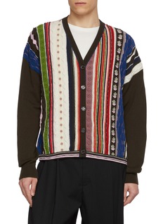 An expressive showcase of Barrie’s knit artistry, this cardigan composes vertical stripes, cable motifs and textured bands into a richly layered cashmere canvas. The V-neck silhouette balances bold patterning with everyday wearability—ideal for enlivening tailored trousers or grounding relaxed separates.