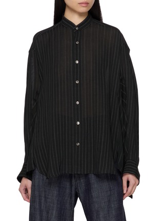 beautiful people 致力于将人们从时尚的成见和惯例中解放出来,无论尺寸、性别、材料、图案和色彩,用服饰语言探索述说每个人的独特美。这款衬衫采用微透条纹面料,采用双向穿设计带来惬意姿态,以独特扇形廓形勾勒摩登率性格调。
