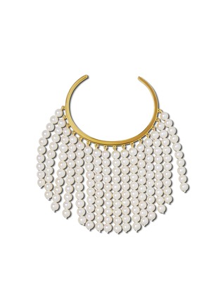 Bijou de M stages a grand finale at the wrist: an open bangle in 18K gold-plated sterling silver from which rows of lustrous freshwater pearls cascade like a curtain. Fluid and theatrical, it sways with every gesture—made for cocktail hours, black-tie, and modern bridal.