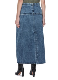 A sculptural silhouette defines this BOWTE skirt, where a washed-denim peplum unfurls from the waist like a soft, architectural ripple. The voluminous maxi cut brings poetic movement to everyday dressing, pairing effortlessly with fitted knits or sharp tailoring for contrast.
