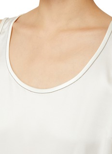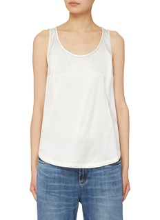 Brunello Cucinelli 擅用质感面料与精致细节诠释极简美学。这款背心以丝滑缎面为基底,柔和的垂坠感消解了无袖单品的凌厉感,修身不紧绷的剪裁贴合身形却不束缚,领口处标志性 Monili 镶珠尽显匠心。可叠穿西装打造商务精英感,或单穿搭配半裙诠释温柔法式风。