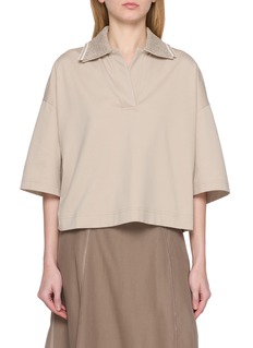 Sporting codes are reimagined through Brunello Cucinelli’s refined lens. Crafted in structured techno couture jersey, the silhouette falls boxy and cropped, while a luminous contrast point collar introduces a subtle note of evening polish. An effortless counterpoint to fluid skirts or tailored trousers.