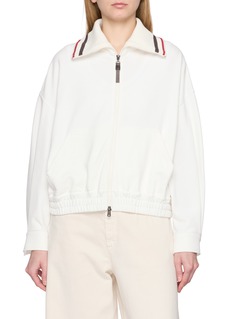 棉抓绒的柔滑肌理与休闲剪裁形成微妙共鸣,Brunello Cucinelli 的条纹翻领消解了开衫的单调感,腰部松紧则在低调中注入视觉层次,让这件单品既能适配居家的松弛时刻,也能从容应对都市日常的多元场景。