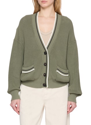 A collegiate sensibility meets Brunello Cucinelli’s quiet refinement in this lightweight cotton cardigan. Framed by contrast stripes along the V neckline and pockets, its softly textured knit drapes with ease—layer over silk camisoles or crisp poplin for a balanced play on structure and softness.