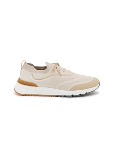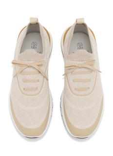Brunello Cucinelli 针织服装的珍贵纱线启发了这款新运动鞋的设计,鞋面以全面针织面料焕新经典款式。热压工艺勾勒的轮廓线条与轻薄舒适的织物外观形成鲜明对比,考究的组合创造出精致的纹理碰撞。