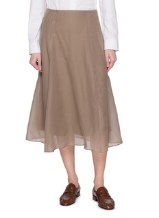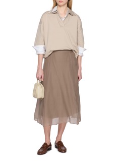 A study in quiet movement, this midi skirt by Brunello Cucinelli is crafted from silk chiffon, gently pleated to create a fluid, airy silhouette. The semi-sheer hem adds depth and dimension, making it an elegant companion to crisp shirting or fine knits for refined day-to-evening dressing.