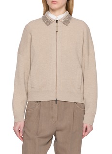 A study in understated opulence, this Brunello Cucinelli cardigan tempers its soft virgin wool and cashmere knit with a luminous sequin-embellished collar. The clean zip front refines the silhouette, making it an elegant layer over crisp shirting for polished weekdays or quiet evening gatherings.