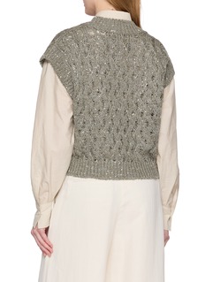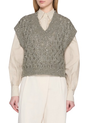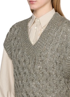 丝麻混纺的通透肌理与亮片针织形成微妙共鸣,Brunello Cucinelli 的镂空纹理消解了针织的厚重感,亮片则在低调中注入视觉层次,让这件单品既能适配晚宴的精致时刻,也能从容应对都市日常的多元场景。
