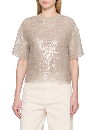 A luminous expression of texture, this Brunello Cucinelli top is crafted in lightweight silk with a softly structured silhouette. Delicate sequinned accents scatter across the surface, catching the light against the sheer grid-like weave—an effortless statement for refined daywear or understated evening styling.