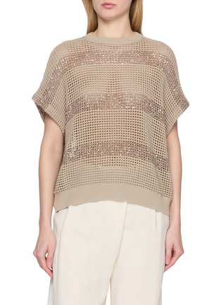 Lightness meets luminosity in this Brunello Cucinelli cotton knit top. Crafted in an airy openwork construction, it is traced with subtle shimmering bands that catch the light with every movement. Layer it over tonal separates for relaxed elegance with a refined, contemporary spirit.
