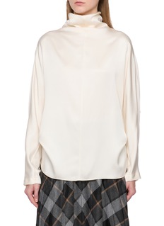 Brunello Cucinelli 以意式传统工艺融合现代设计,诠释低调奢华。这款上衣以柔滑真丝面料衬显质感,宽松廓形留足舒展空间,高领设计优雅温润,搭配格纹半裙,尽显意式儒雅格调。