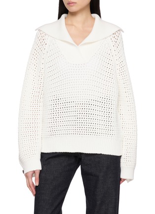 Brunello Cucinelli 凭借对传统工艺的坚持和对品质的追求,持续创造兼具舒适与美感的时尚单品。这款针织衫以大翻领设计衬出优雅肩颈,镂空肌理兼顾透气与质感,宽松版型舒展不束缚,打配牛仔添松弛高级感,是轻熟风日常的质感单品。
