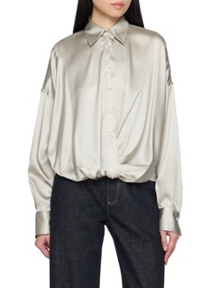 This Brunello Cucinelli silk shirt captures fluid sophistication with its lustrous drape and wrap-inspired silhouette. Crafted from smooth stretch silk satin, it moves effortlessly with the body, accentuating the light. Finished with a pointed collar and elongated cuffs, it brings understated glamour to day-to-evening styling.