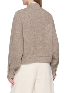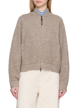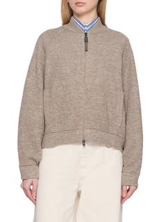 混色针织的细腻肌理与休闲剪裁形成微妙共鸣,Brunello Cucinelli 的短款设计消解了开衫的厚重感,棒球领则在低调中注入视觉层次,让这件单品既能适配都市日常的休闲时刻,也能从容应对通勤造型的多元场景。
