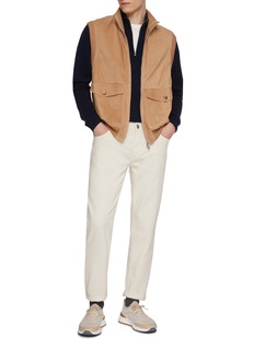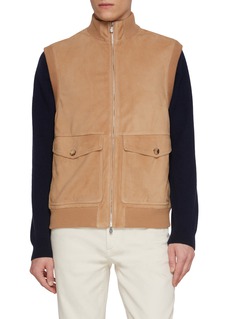 Brunello Cucinelli 以意大利精湛工艺与奢华质感闻名,诠释低调优雅美学。这款马甲采用质感绒面皮制成,罗纹饰边结合宽大翻盖口袋更添都市休闲格调。