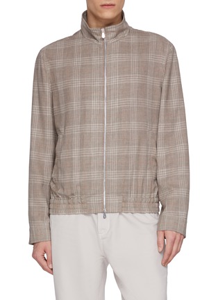 Discover the Brunello Cucinelli Men's Checked Zip-Up Jacket, a harmonious blend of luxury and casual style. This jacket is intricately crafted from a premium wool blend, featuring a classic check pattern in subdued earth tones. Its streamlined design is highlighted by a sleek zip front and a high collar, offering both warmth and a modern aesthetic.