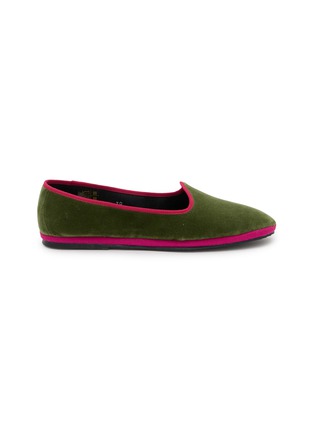 Softly structured with a plush sensibility, these Friulana slippers are rendered in velvety texture and finished with vivid grosgrain edging. Lined with a sage-toned insole, it lends warmth and character to refined loungewear or effortless day-at-home styling.