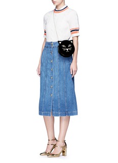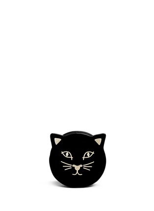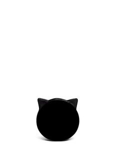 Charlotte Olympia的猫脸造型配饰拥有极高的街头曝光率,不妨以此款斜挎包为您的造型添上亮丽一笔,天鹅绒面料透出奢华格调,金色猫脸刺绣图案与黑色主调对比鲜明,配以猫耳设计更为精致,从细节处体现您的幽默个性。