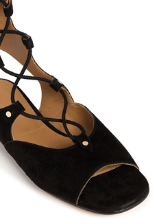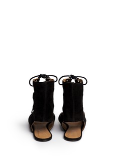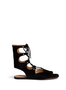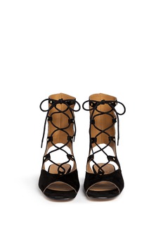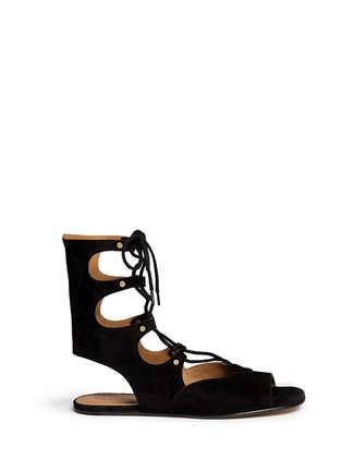 这款潇洒帅气的凉鞋属蔻依出品,半圆镂空设计与交叉系带的设计别具一格,搭配黑色麂皮,保留了品牌法式优雅贵气的同时,散发令人难以抗拒的中性酷感。