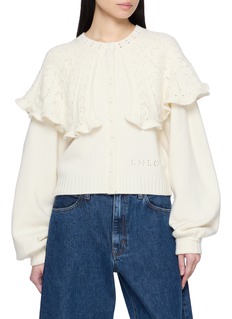 This cardigan reinterprets Chloé’s romantic codes through a softly draped capelet overlay, lending movement and lightness to a classic knit silhouette. Crafted in a wool and cashmere blend, it layers beautifully over denim or tailoring, ideal for transitional dressing with poetic ease.