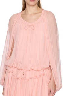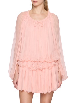 Airy and romantic, this mini cape dress channels Chloé’s signature softness through layers of softly gathered organic silk mousseline. Ruffles and fluid pleats create graceful movement, while drawstring ties with gold-tone tips lend a refined finish for garden soirées or effortless evening moments.