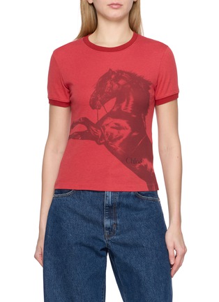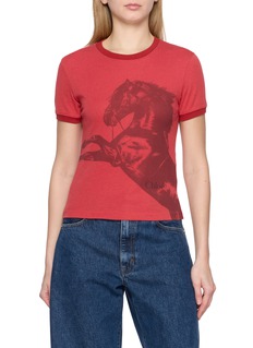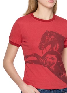 This Chloé T-shirt is a captivating blend of casual sophistication and artistic flair. Featuring a bold equestrian print, it reflects the brand's affinity for free-spirited, feminine designs. The rich terracotta hue sets a warm, inviting tone, while the silhouette remains classic with a round neckline and short sleeves, ensuring it pairs effortlessly with both jeans and skirts.