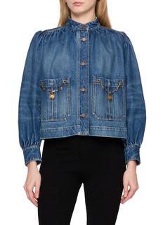 This Chloé denim jacket redefines classic with a touch of luxury. The rich blue denim is expertly washed for a vibrant yet vintage feel, while the high neckline and structured shoulders add a modern twist to the traditional silhouette. Distinctive features, like the gold-tone chain detail with a Chloé medallion, infuse a sense of refined elegance. Buttoned front closures and practical flap pockets ensure functionality without compromising on style.