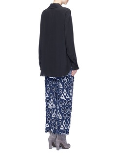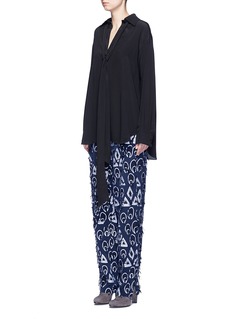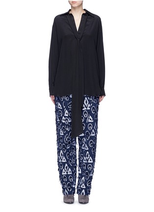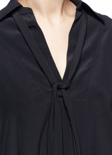 此款蔻依的上衣秉持品牌对品质的追求,采用质感轻薄的优质真丝面料打造,翻折V领的设计兼具性感与中性格调,附有一根领带装饰以增强细节感,简洁的款式是日常百搭首选。