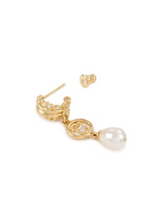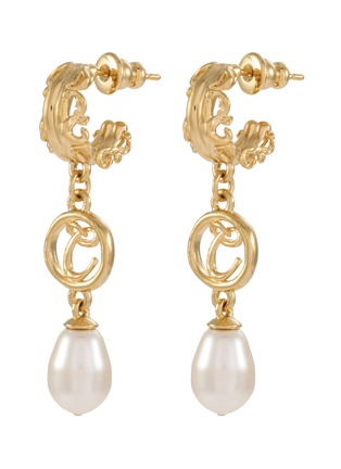 Chloé Classy dangling earrings in gold brass, featuring ornamental details, a cursive C medal and a glass pearl pendant. Adorned with a Chloé logo engraving to sign these earrings, the pair strikes the perfect balance between style and class.