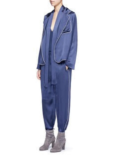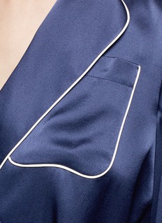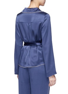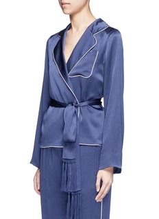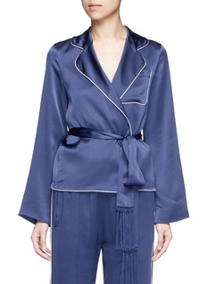 睡衣热潮近季风靡时装界,蔻依此款上衣以柔顺的缎面真丝面料营造如睡衣般亲肤的感觉,利用一根腰带取代钮扣开襟更为舒适,腰带末端缀有流苏,于您步行间摇曳摆动,散发轻松自在感觉。