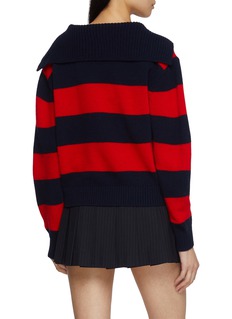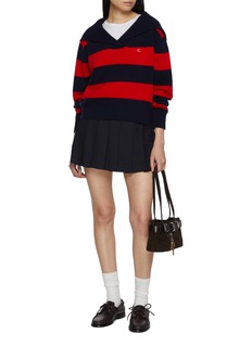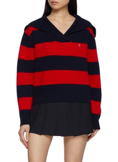 Clove’s striped knit reimagines nautical charm with a modern softness, crafted from a merino wool–cashmere blend that feels warm yet refined. The sailor collar adds a playful architectural fold, while bold red and navy stripes bring effortless impact. A statement knit that pairs easily with pleated skirts or tailored denim.
