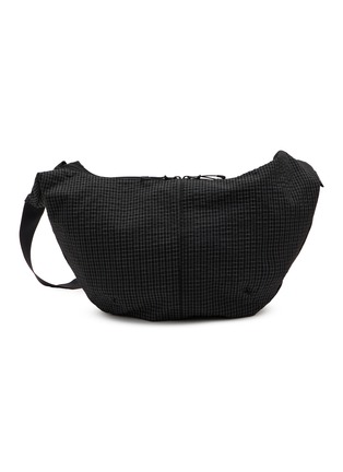 Comme des Garçons Homme presents an oversized belt bag with distinctive grid-check pattern and sculptural curved silhouette for generous capacity. The structured design with dual-zip top closure and adjustable webbing strap delivers versatile crossbody or waist carrying, while refined construction creates a statement accessory for discerning modern lifestyles.